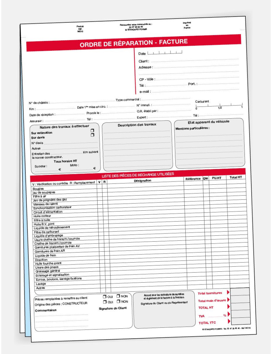 L'ordre de réparation est un document qui décrit les travaux à effectuer sur le véhicule ainsi que les coûts associés. Il sert de contrat entre le client et le réparateur, et permet de s'assurer que les travaux sont effectués conformément aux attentes du client. Faites signer votre client et laissez-lui une copie de cet ordre de réparation afin de vous protéger de toute réclamation possible. 3ème feuillet cartonné avec carte de pointage.