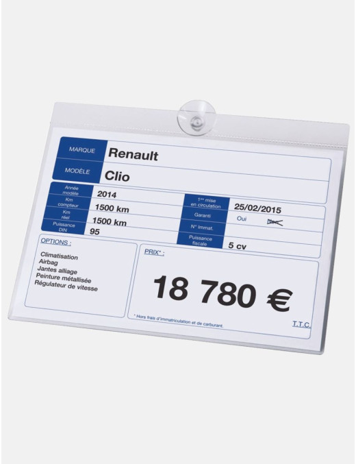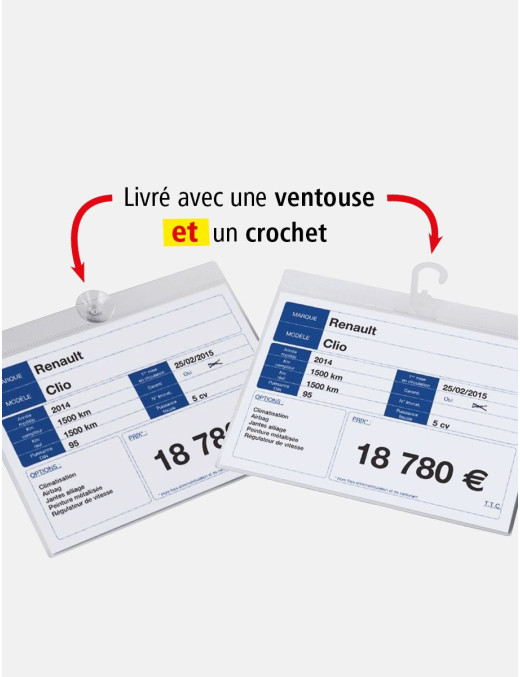 Idéal pour afficher les informations de prix, ce porte-affichette horizontal en polycarbonate transparent permet d'insérer facilement un format A4. Pratique et polyvalent, il peut être fixé en toute simplicité sur le rétroviseur grâce au crochet ou sur la vitre latérale à l'aide de la ventouse inclus.