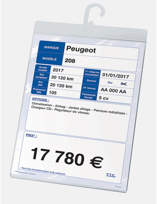 Idéal pour afficher les informations de prix, ce porte-affichette vertical en polycarbonate transparent permet d'insérer facilement un format A4. Pratique et polyvalent, il peut être fixé en toute simplicité sur le rétroviseur grâce au crochet ou sur la vitre latérale à l'aide de la ventouse inclus.