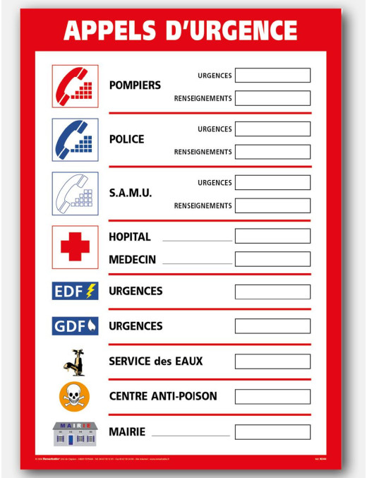 Ce panneau Appels d’urgence est OBLIGATOIRE à afficher de manière apparente dans les locaux de l'entreprise. Il est relatif à l'article D. 4711-1 du Code du travail.