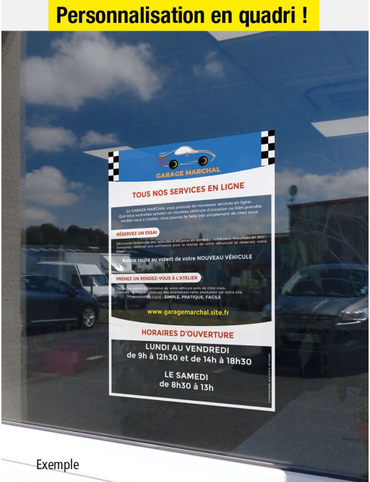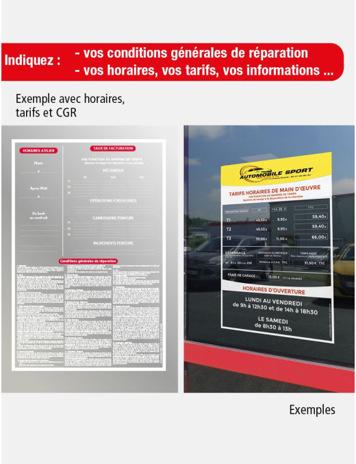 Support vitrophanie transparent 100 microns longue durée à coller à l’intérieur d'une vitre. Il affiche les tarifs des différentes prestations proposées par le garage, ainsi que les horaires d'ouverture et de fermeture de l'atelier. Pose sans bulle. Entièrement personnalisable selon les informations que vous nous fournissez (horaires, tarifs, etc). Impression quadri de votre logo, texte blanc pour une lisibilité optimale sur la vitre.