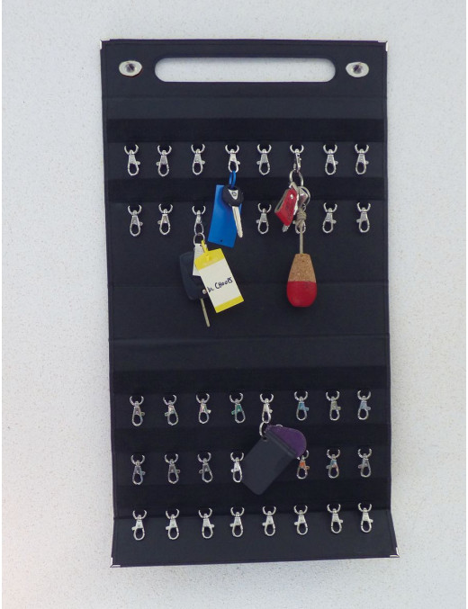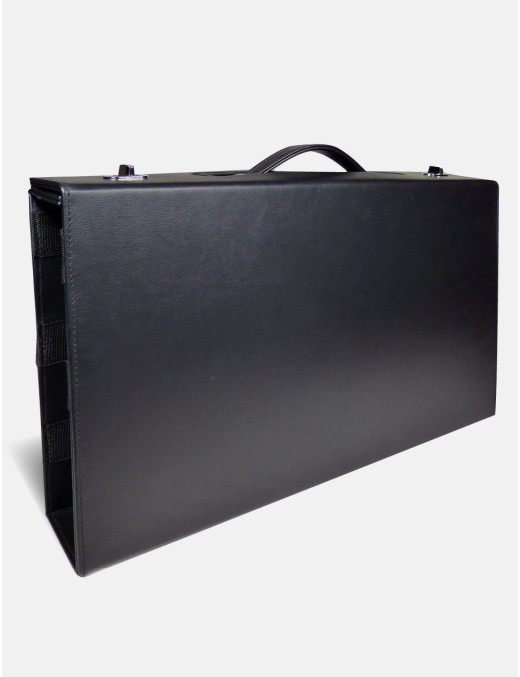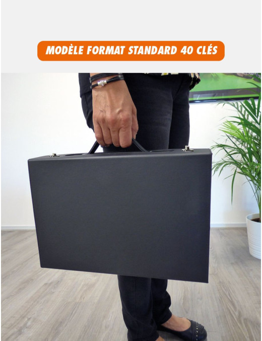 Valisette clés rigide de très belle qualité en simili cuir noir grainé pouvant contenir 40 clés. Avec sa tranche élargie, elle permet aux clés de ne pas se chevaucher pendant le transport. Ouverte, vous pouvez l'accrocher au mur grâce aux attaches œillet de fermeture. À l'intérieur 5 rangées de 8 mousquetons métal. Fermeture par 2 attaches papillon sur le dessus, poignée de transport solide et esthétique. Coins métal. Au dos, une pochette zippée pour y ranger les cartes grises.