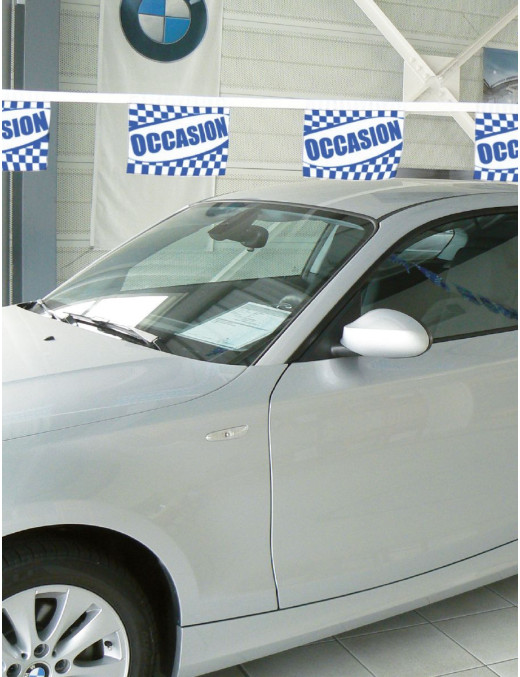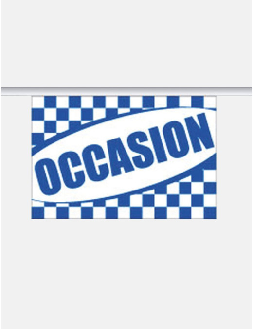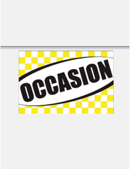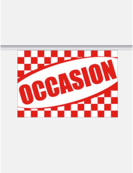 La guirlande occasion est un accessoire décoratif idéal pour animer votre showroom ou votre parc. Fabriquée en tissu supralon de haute qualité, elle est légère et durable, ce qui la rend parfaite pour une utilisation en extérieur. Format des fanions : 20 x 30 cm. Nombre de fanions : 24. Longueur totale de la guirlande : 10 mètres.