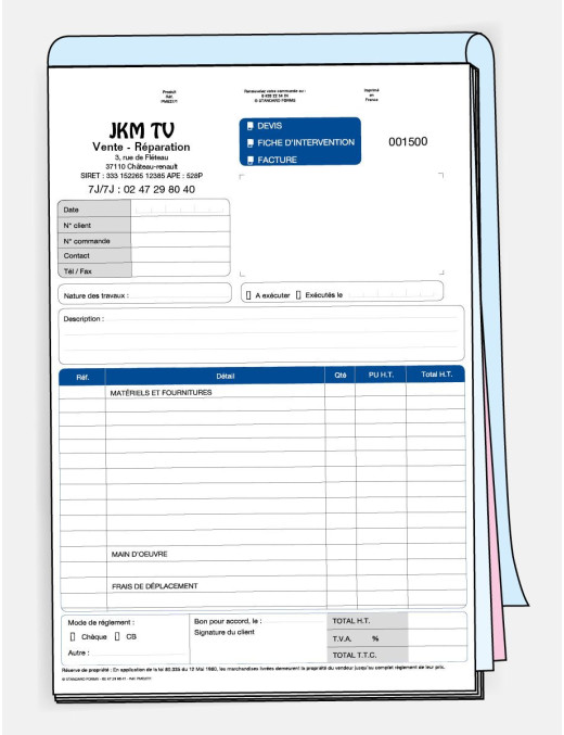 Imprimé économique multi-fonctions “3 en 1” : Devis - Facture - Bon d'intervention.