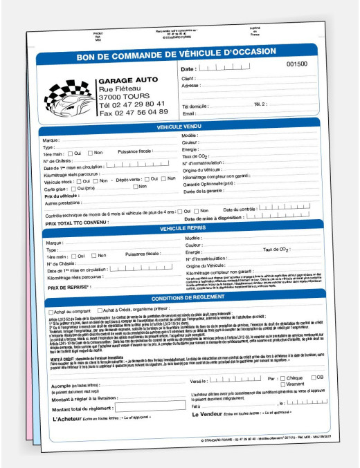 Bon de commande pour un véhicule d'occasion contenant les informations telles que le nom et les coordonnées du client, les détails du véhicule (marque, modèle, année, kilométrage, etc.), le prix de vente convenu, les conditions de paiement et de livraison, ainsi que les garanties éventuelles. Une fois le bon de commande signé par les deux parties, il devient un contrat de vente légalement contraignant et permet le transfert de propriété du véhicule d'occasion du vendeur à l'acheteur.