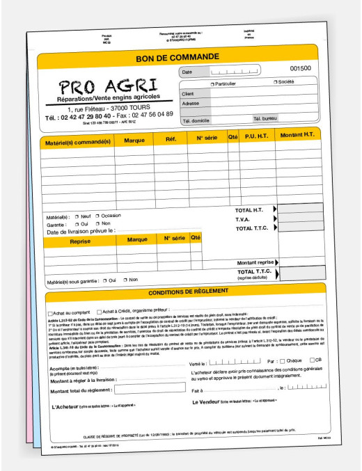 Le bon de commande est un document comprenant trois exemplaires autocopiants. Les conditions générales de vente sont stipulées au dos. Ce document est utilisé pour formaliser l'achat de matériel neuf ou d'occasion et précise les caractéristiques du matériel commandé, le prix convenu, les modalités de paiement et de livraison, ainsi que les garanties éventuelles. En signant le bon de commande, le client s'engage à respecter les conditions générales de vente et confirme son intention d'acheter le matériel tel qu'il a été décrit dans le bon de commande. Ainsi le bon de commande devient un contrat légalement contraignant.