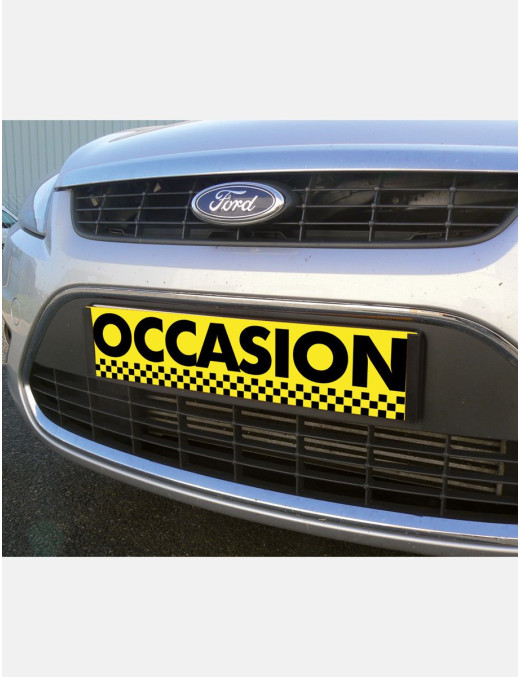 Ce cache-plaque Occasion est un accessoire qui permet de mettre en valeur vos véhicules exposés sur votre parc. Matière souple, épaisseur 1 mm. Il s’accroche à la plaque d’immatriculation grâce au fixe plaque à acheter en supplément.