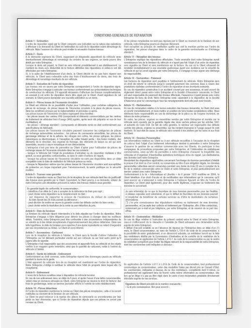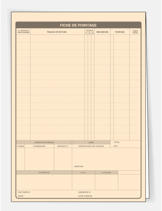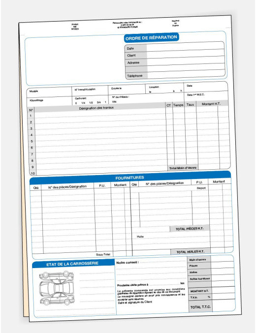 L'ordre de réparation est un document qui décrit les travaux à effectuer sur le véhicule ainsi que les coûts associés. Il sert de contrat entre le client et le réparateur, et permet de s'assurer que les travaux sont effectués conformément aux attentes du client. Faites signer votre client et laissez-lui une copie de cet ordre de réparation afin de vous protéger de toute réclamation possible. 2ème feuillet cartonné avec carte de pointage.