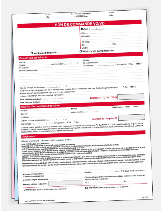 Bon de commande pour un véhicule d'occasion contenant les informations telles que le nom et les coordonnées du client, les détails du véhicule (marque, modèle, année, kilométrage, etc.), le prix de vente convenu, les conditions de paiement et de livraison, ainsi que les garanties éventuelles. Une fois le bon de commande signé par les deux parties, il devient un contrat de vente légalement contraignant et permet le transfert de propriété du véhicule d'occasion du vendeur à l'acheteur.