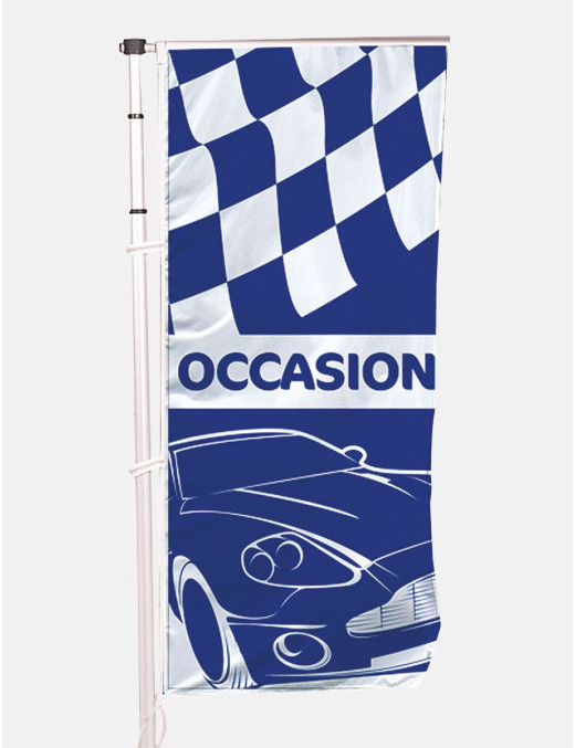 Opter pour des voiles pour animer votre parc auto, c'est aussi choisir une solution pratique et économique. Faciles à installer et à entretenir et résistantes aux intempéries. Voile rectangulaire en maille 100% polyester 115g. Impression inaltérable, graphique visible double face par transparence. Drapeau pour mât à potence. Montage fourreau, 3 sangles d'accrochage et un mousqueton.