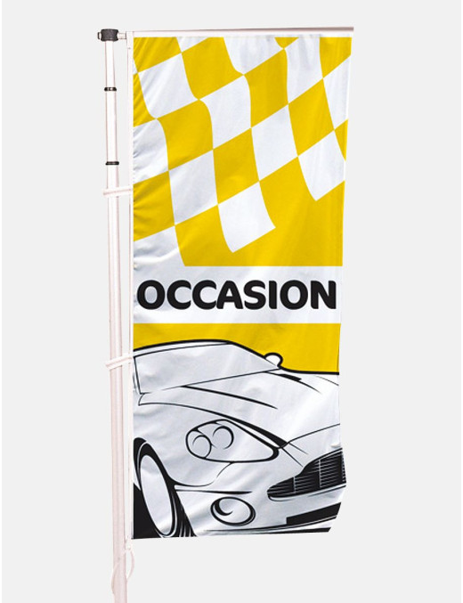 Opter pour des voiles pour animer votre parc auto, c'est aussi choisir une solution pratique et économique. Faciles à installer et à entretenir et résistantes aux intempéries. Voile rectangulaire en maille 100% polyester 115g. Impression inaltérable, graphique visible double face par transparence. Drapeau pour mât à potence. Montage fourreau, 3 sangles d'accrochage et un mousqueton.