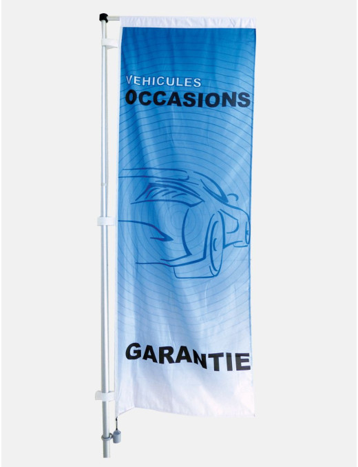 Opter pour des voiles pour animer votre parc auto, c'est aussi choisir une solution pratique et économique. Faciles à installer et à entretenir et résistantes aux intempéries. Voile rectangulaire en maille 100% polyester 115g. Impression inaltérable, graphique visible double face par transparence. Drapeau pour mât à potence. Montage fourreau, 3 sangles d'accrochage et un mousqueton.