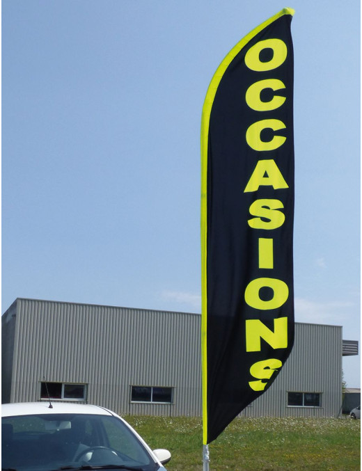 Opter pour ces voiles pour animer votre parc auto, c'est aussi choisir une solution qui se voit de loin. Faciles à installer et à entretenir et résistantes aux intempéries. Voile Beach line grand format 100% polyester 115g. Impression inaltérable, graphique visible double face par transparence. Fourreau latéral élastique noir, ourlets sur les pourtours et un mousqueton. S’adapte uniquement sur le mât du kit KIT7540.