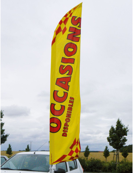 Pour animer votre parc auto, l'utilisation de drapeaux est une idée originale et efficace. Voile Beach line grand format 100% polyester 130g. Impression inaltérable, graphique visible double face par transparence. Fourreau latéral élastique noir, ourlets sur les pourtours et un mousqueton. Ces drapeaux s’utilisent uniquement avec le kit mât M737.
