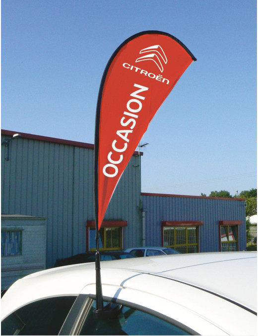 Opter pour ces drapeaux de vitre pour animer votre parc auto, c'est aussi choisir une solution pratique et économique. Kit drapeau de vitre complet (mât + voile). Drapeau en maille 115g forme goutte. Il se positionne sur la vitre du véhicule. La gouttière est glissée sur le haut et est maintenue en fermant la vitre. Il tourne avec le vent. Compatible avec le système anti-pincement des vitres. Impression quadri de votre personnalisation (texte + logo) sur une surface de 80 x 23 cm. Fourreau latéral élastique noir et un mousqueton.