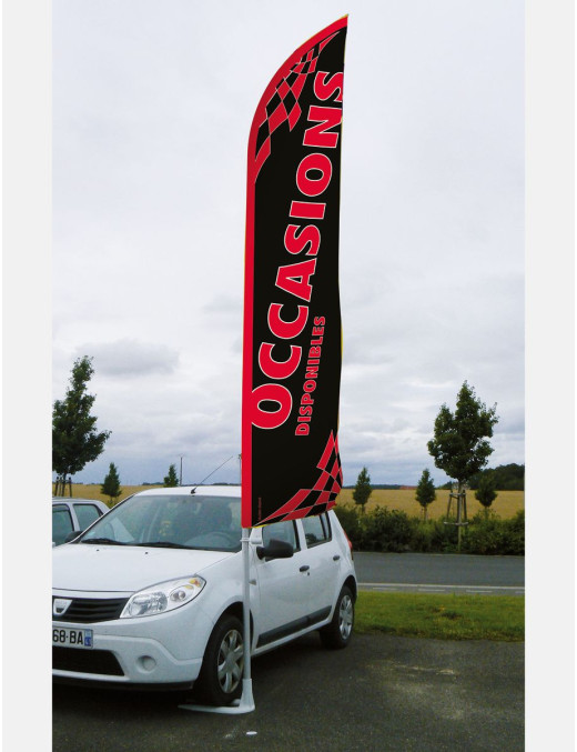 Opter pour ces voiles pour animer votre parc auto, c'est aussi choisir une solution qui se voit de loin. Faciles à installer et à entretenir et résistantes aux intempéries. Grâce aux roulements à bille du scion, la voile tourne au gré du vent. Voile Beach line grand format 100% polyester 115g. Fourreau latéral élastique noir, ourlets sur les pourtours et un mousqueton. Impression inaltérable visible double face par transparence. Le Kit est composé de : 1 voile bleu ou rouge ou jaune + 1 mât télescopique de 4 m + 1 scion en inox + 1 pied autocal.