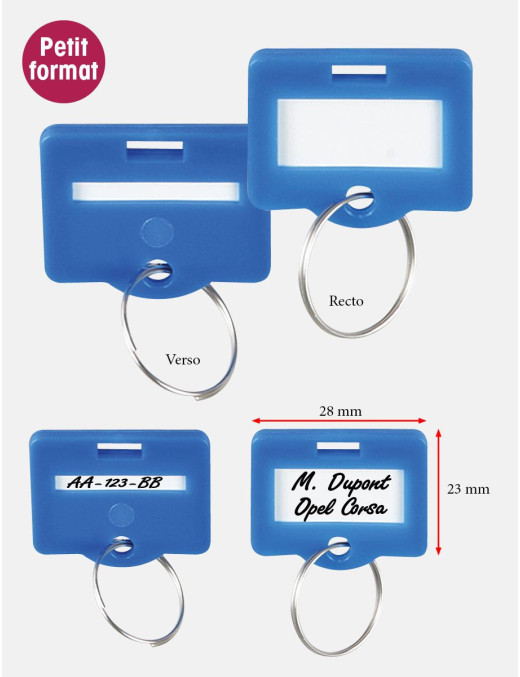 Porte-clés d'identification compact de petit format, doté d'un anneau pour tableaux d'affichage mural ou armoire à clés. Deux inserts avec étiquette en papier (recto et verso) offrent la possibilité d'inscrire le numéro de la plaque et le nom du client, par exemple. Le code couleur facilite une catégorisation rapide et simplifie la recherche de la clé.