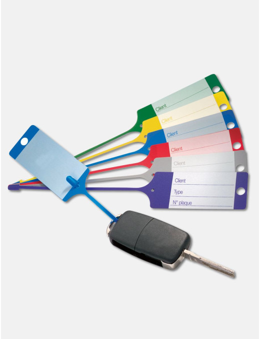 Etiquettes clés en plastique souple avec languette spécialement conçues pour le rangement des clés à l'atelier. Chaque étiquette comprend un espace recto et verso pour écrire des informations d'identification claires.