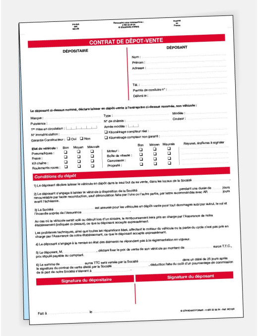 Un contrat de dépôt-vente moto est un accord entre un propriétaire de véhicule et un prestataire de services, dans lequel le propriétaire confie son véhicule au prestataire pour qu'il le vende en son nom. Le prestataire s'engage à vendre le véhicule au meilleur prix possible et à reverser une partie du montant de la vente au propriétaire, après déduction de ses frais de commission. Le contrat précise également les conditions de vente, les responsabilités de chaque partie et les modalités de résiliation du contrat.