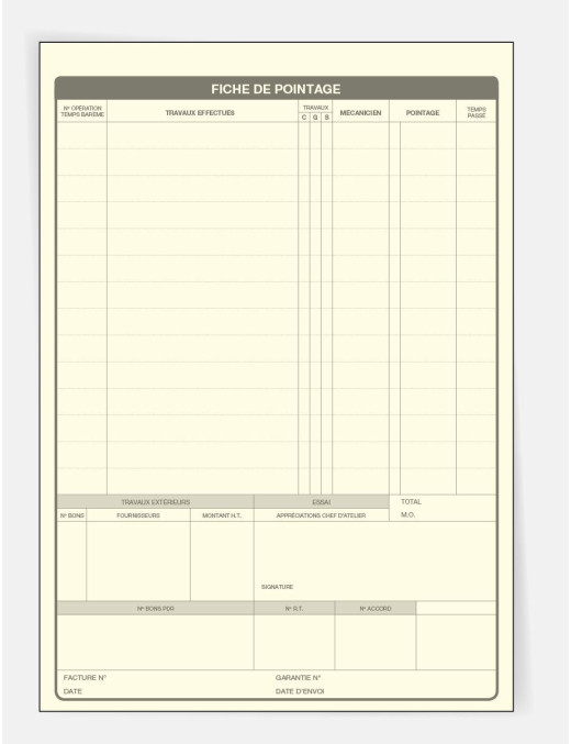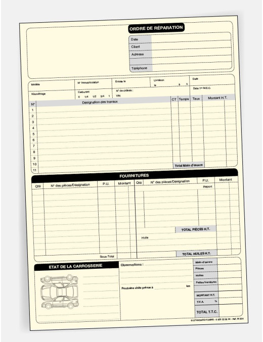 Cette fiche d'ordre de réparation est spécialement destinée à l'atelier. Elle est un document utilisé pour consigner les informations relatives aux réparations effectuées sur le véhicule par le salarié. Ensuite elle permet de transmettre ces informations au service de facturation. Exemplaire cartonné.