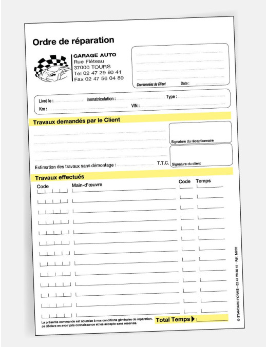 La fiche d'ordre de réparation/Facture en atelier est un document utilisé pour consigner les informations relatives aux réparations effectuées sur le véhicule par le salarié. Produit 2 en 1 très pratique.