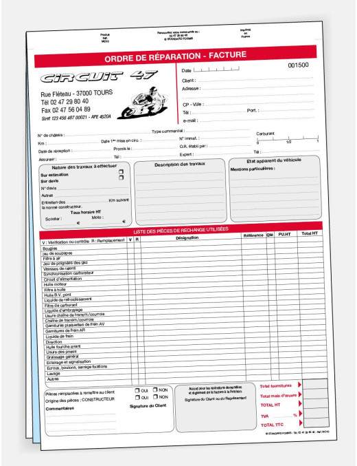 L'ordre de réparation est un document qui décrit les travaux à effectuer sur le véhicule ainsi que les coûts associés. Il sert de contrat entre le client et le réparateur, et permet de s'assurer que les travaux sont effectués conformément aux attentes du client. Faites signer votre client et laissez-lui une copie de cet ordre de réparation afin de vous protéger de toute réclamation possible. 3ème feuillet cartonné avec carte de pointage.