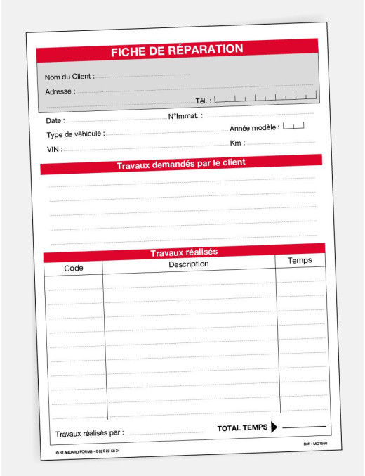 La fiche d'ordre de réparation en atelier est un document utilisé pour consigner les informations relatives aux réparations effectuées sur le véhicule par le salarié. Ensuite, elle permet de transmettre ces informations au service de facturation.