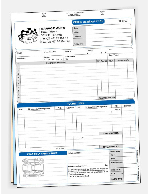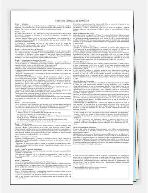 L'ordre de réparation est un document qui décrit les travaux à effectuer sur le véhicule ainsi que les coûts associés. Il sert de contrat entre le client et le réparateur, et permet de s'assurer que les travaux sont effectués conformément aux attentes du client. Faites signer votre client et laissez-lui une copie de cet ordre de réparation afin de vous protéger de toute réclamation possible. 3ème feuillet cartonné avec carte de pointage.