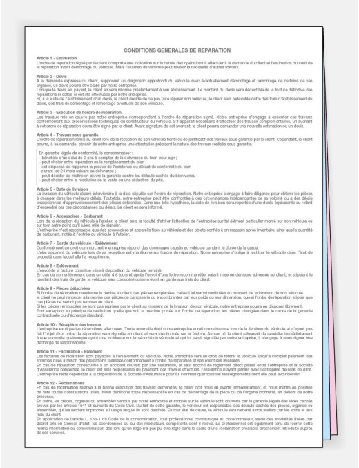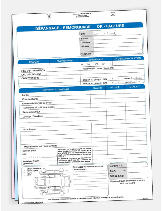 Imprimé essentiel lors de vos interventions pour enregistrer les informations liées à l'intervention, telles que le véhicule concerné, les coordonnées du client, la nature de la panne ou de l'accident, les actions réalisées, etc. Une fois les travaux réalisés, le client peut se voir remettre une facture correspondant aux prestations fournies et aux pièces utilisées, avec un détail des coûts engagés.