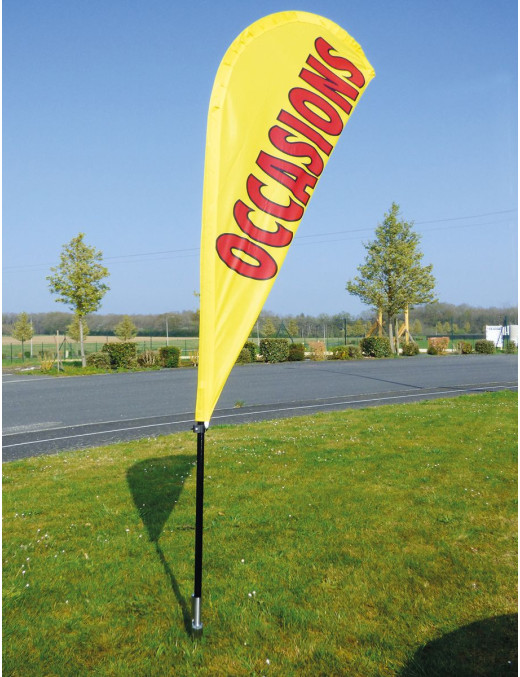 Une fois plantés dans le sol, emboitez le mat et le drapeau dans le tube métallique et c'est tout, votre PLV est en place.