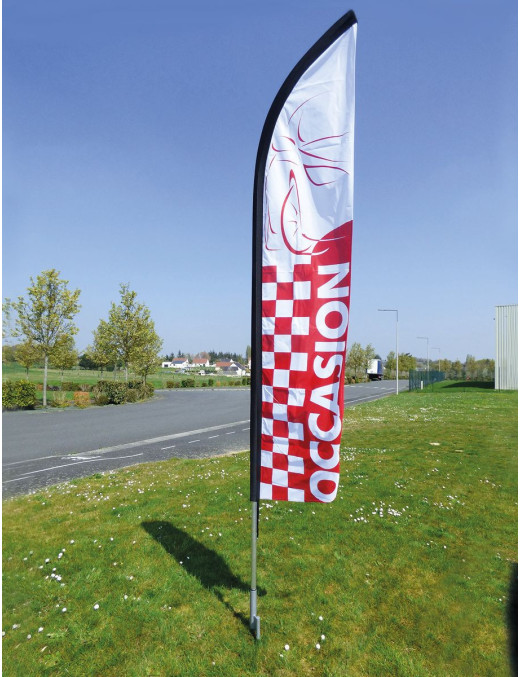Une fois plantés dans le sol, emboitez le mat et le drapeau dans le tube métallique et c'est tout, votre PLV est en place.