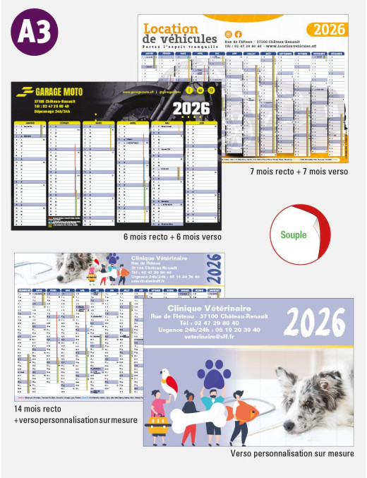 Calendrier bancaire souple, impression quadri de votre personnalisation recto/verso sur papier satin 350 g haute qualité. Vacances scolaires, sans lunaison. Format A4 ou A3.