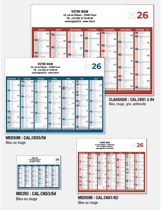Calendrier bancaire rigide imprimé sur papier couché mat 100g, contrecollage sur carton 1020g. 7 mois recto, 7 mois verso. 2 œillets et 1 cordonnet. Personnalisation 1 couleur sur le bandeau du haut.