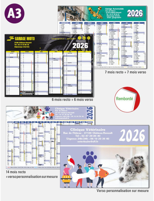 Calendrier bancaire rembordé (rigide), impression quadri recto/verso de votre personnalisation sur papier couché brillant 150 g + contrecollage sur carton mat 2 mm.