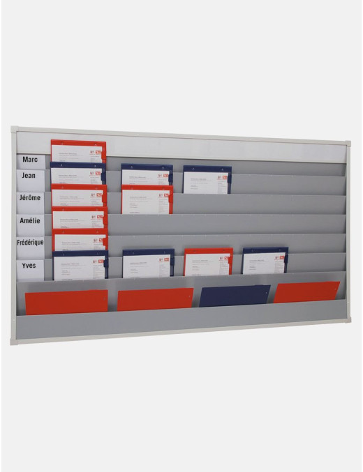 Le chef d’atelier organise le travail, chaque technicien prend le porte-OR dans son compartiment et dépose une copie de l’OR dans le planning à la tranche horaire correspondante. Lorsque le travail est terminé, le porte-OR et son contenu sont placés dans le compartiment "Contrôle final". D’un simple coup d’œil vous suivez la charge de travail en permanence. Ce modèle comporte une réserve pour ranger les porte OR non utilisés.