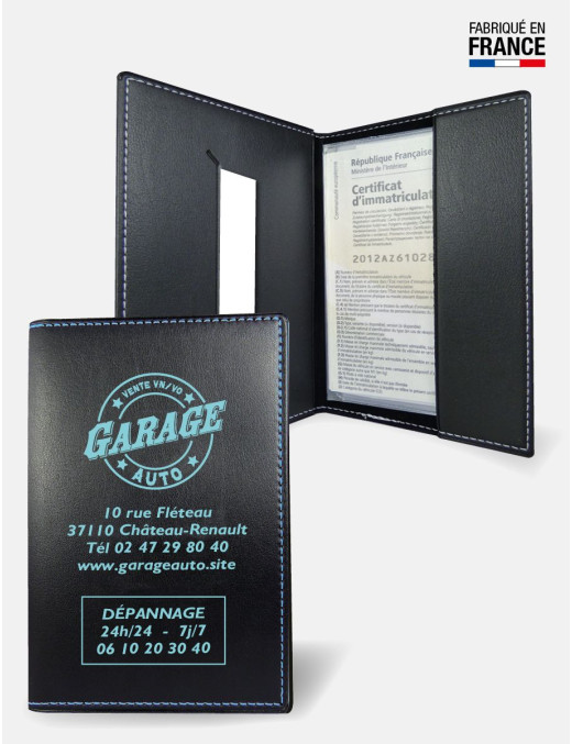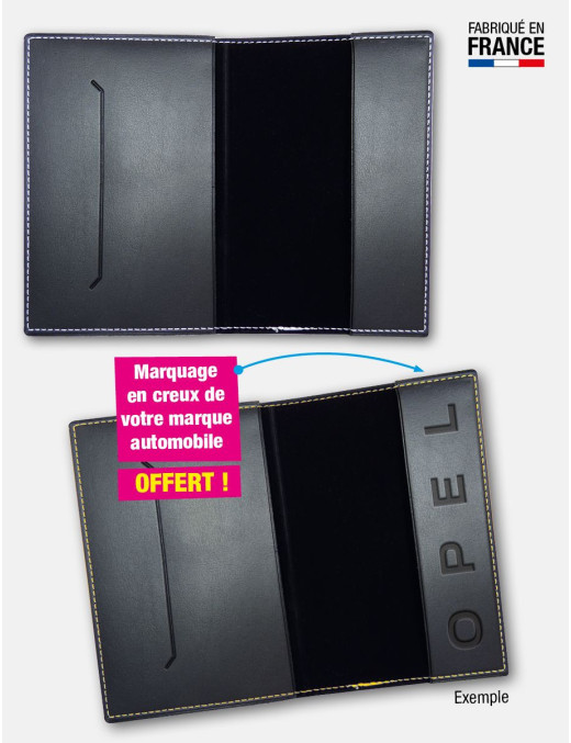 Très bel étui 2 volets pleins en PVC expansé aspect grain fin cuir noir avec doublure velours noire flockée teintée dans la masse. Finition cousue noire ou contrastée : blanc, bleu turquoise, bleu royal, marine, rouge, vert, jaune, gris clair, gris foncé, anis, orange. A l’intérieur côté gauche, une grande pochette avec une fente pour insérer une carte de visite. A droite, un petit rabat en retour. Une pochette cristal indépendante pour l’insertion de la carte grise. Impression de votre personnalisation en 1 couleur au choix sur le premier volet.