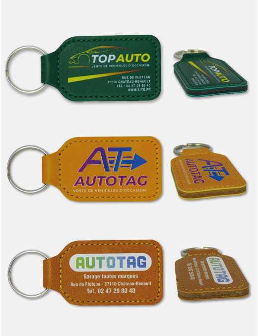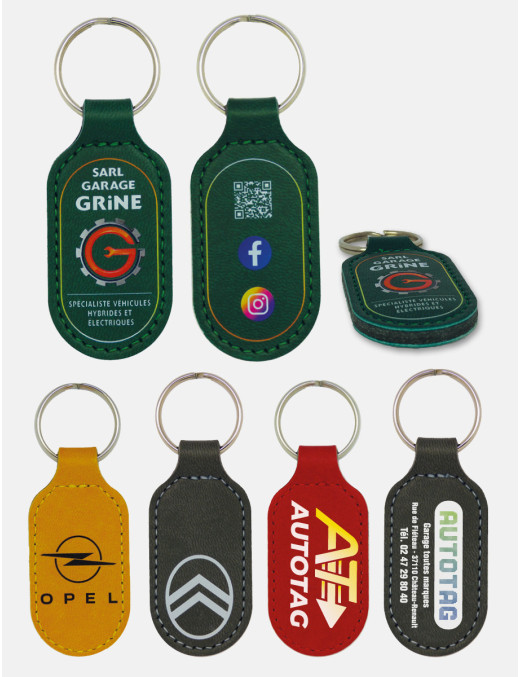 Porte-clés en simili cuir caoutchouc touché velouté, finition cousue ton sur ton. Impression quadri de votre personnalisation recto ou recto/verso. Dimensions : goutte d'eau PUV97* (40 x 68 mm), ovale PUV98* (33 x 68 mm), rectangle arrondi PUV99* (38 x 68 mm). Epaisseur : 5 mm. Anneau 28 mm.