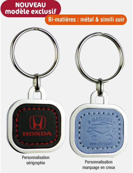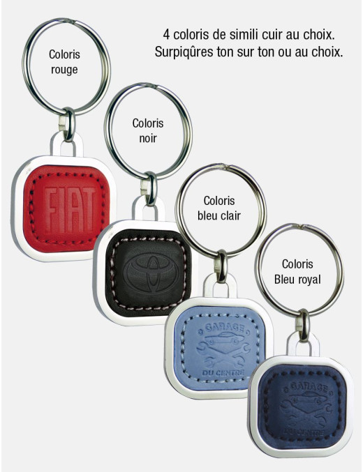Découvrez notre porte-clés en métal brillant à la forme carrée, coins arrondis. 4 coloris de simili cuir au choix.