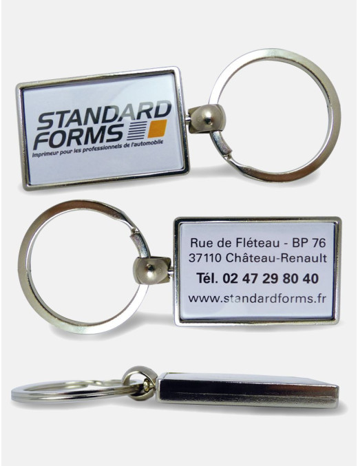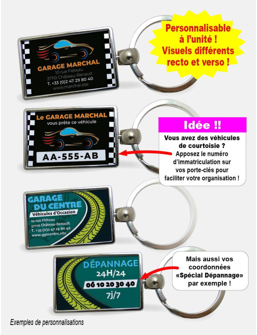 Vous pouvez par exemple noter les numéros d'immatriculation de vos véhicules de prêt pour optimiser votre organisation, mettre un numéro de dépannage d'urgence ou toutes autres informations. Porte-clés en métal avec attache standard et anneau 34 mm. Impression quadri sur papier encapsulé sous étiquette plastique. Dimensions de la personnalisation 25 x 40 mm.