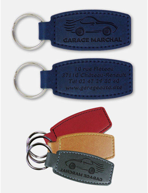 Porte-clés en simili cuir caoutchouc touché velouté, finition cousue. Un cadeau haute qualité personnalisé qui marquera les esprits et renforcera votre relation client. Marquage en creux de votre personnalisation recto/verso (le recto et le verso peuvent avoir un marquage différent). Coloris de la surpiqûre au choix : beige, bleu clair, fuschia, bleu, noir, gris, blanc, rouge, marron, orange, jaune, bordeaux, vert. Dimensions : rectangle arrondi PU88* (90 x 32 mm), blason PU89* (48 x 88 mm), rond PU90* (45 x 77 mm). Anneau 28 mm. Panachage des couleurs possibles par lot de 25 pièces de chaque couleur.