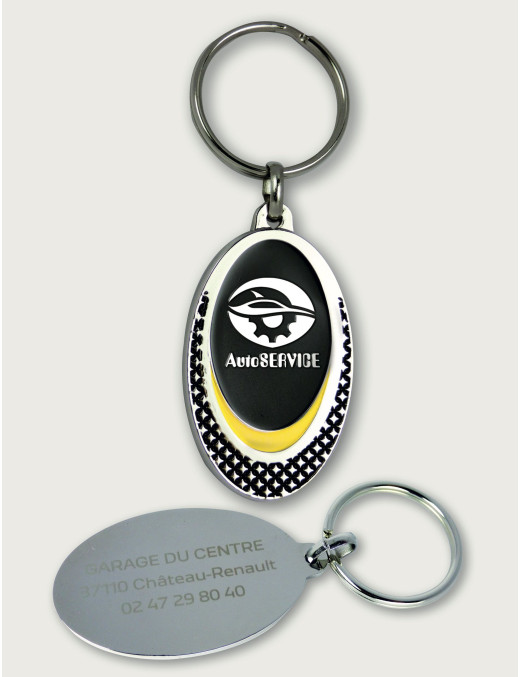 Porte-clés métal brillant aux formes originales, recto/verso plats. Choisissez un modèle, puis transmettez-nous votre logo (forme simple, sans dégradé). Recto métal brillant émaillé, couleurs selon votre choix (à préciser, 4 couleurs maxi). Au verso, gravure laser (sans émaillage) de vos coordonnées sur fond métal brillant. Bélière + anneau 30 mm.