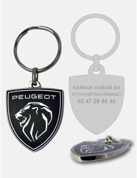 Ce porte-clés forme bouclier Peugeot en métal au design élégant et raffiné est un cadeau idéal pour vos clients. Grâce à sa solidité et sa durabilité, il laissera une impression positive à vos clients. Finition métal brillant et émaillage noir mat au recto. Anneau 30 mm. Personnalisation laser sur le verso écriture bâton (3-4 lignes maxi).
