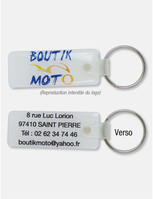 Ce porte-clés en résine dôming est spécialement conçu pour ne pas endommager le réservoir de la moto. Un cadeau personnalisé qui marquera les esprits et renforcera votre relation client. Porte-clés résine bombée forme rectangulaire. Attache de liaison en plastique transparente + anneau 25 mm. Impression numérique quadri recto/verso.