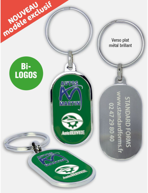 Ce modèle unique et sophistiqué vous offre la possibilité d'intégrer 2 logos. Porte-clés en métal brillant sur fond émaillé de couleur (4 maxi). Au verso, gravure laser de vos coordonnées sur fond métal brillant (4 lignes maxi). Recto/verso plats. Bélière + anneau ø 30 mm.