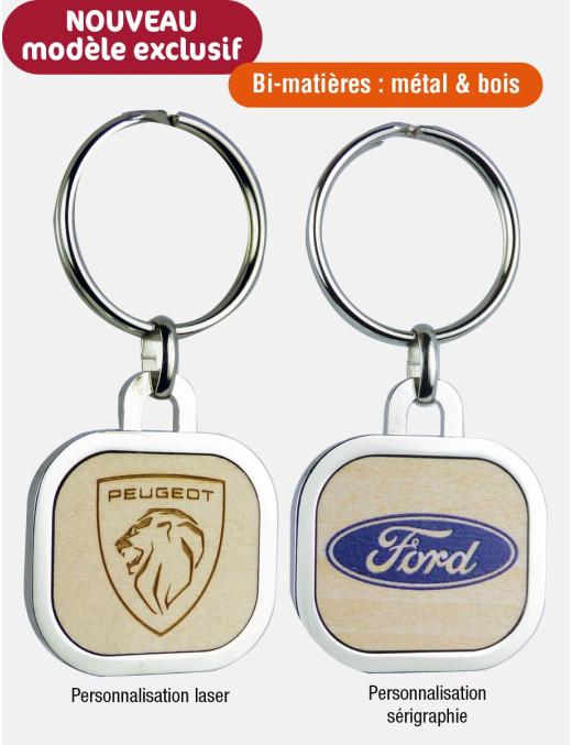 Découvrez notre porte-clés en métal brillant à la forme carrée, coins arrondis. Personnalisez la partie centrale en bois clair encastrée sans sur épaisseur, finition vernis brillant.