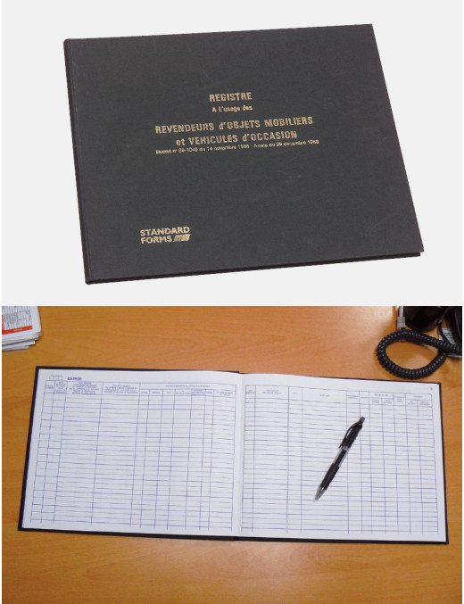 Le registre de police est un document officiel obligatoire afin de surveiller les transactions de biens entre les revendeurs et les particuliers. Ce registre contient des informations telles que l'identité du revendeur, la nature des objets vendus, les prix de vente, les dates et lieux des transactions, ainsi que les détails des pièces d'identité présentées par les parties impliquées. Il peut vous être demandé à tout instant par les autorités publiques.