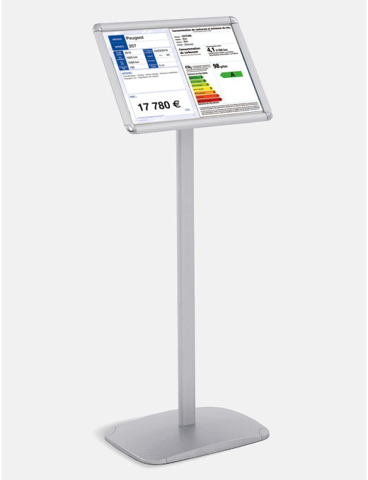 Le cadre rotatif Cadro-Clic® A3 est idéal pour une utilisation en mode portrait ou paysage. Grâce à sa conception pivotante, vous pouvez facilement changer l'orientation du cadre selon vos besoins. Permet d’insérer un format A3 ou deux A4. Cadre incliné à 45° + un protecteur plexi antireflet. Piètement aluminium anodisé naturel sur socle lesté.