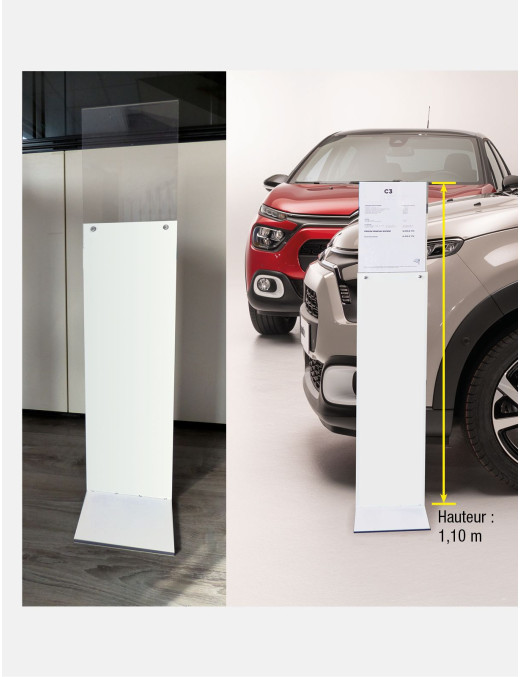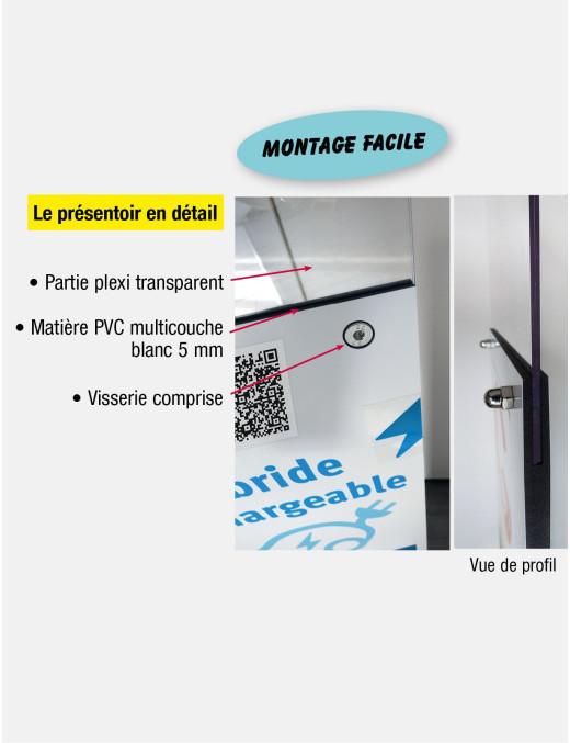 Présentoir de prix pour showroom. Structure en T (un pied + une base) à monter en PVC multicouche blanc 5 mm. Poids 1,6 kg. Noyau en PVC expansé léger et recyclé noir encapsulé entre de 2 plaques de PVC blanc lisse et solide. Excellente résistance aux produits chimiques et au feu. Une partie supérieure en plexi transparent pour glisser votre affichette de prix est à insérer et à visser sur la base. Montage facile par emboîtement de la base dans le pied. Visserie fournie. Utilisation intérieure. Vous pouvez personnaliser le présentoir par une impression directement sur le support et/ou par des adhésifs imprimés repositionnables. Les adhésifs vous permettent de changer de message comme vous le souhaitez selon le véhicule présenté (ex. un QR code de la fiche du véhicule, son énergie…).